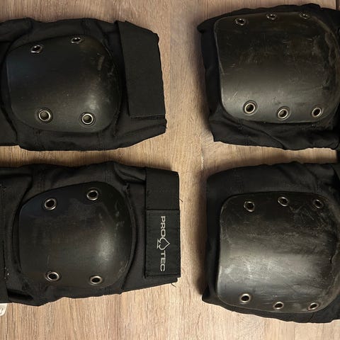 SkatePro beskyttelsesudstyr sæt i størrelse M, inkluderer knæbeskyttere, albuebeskyttere og håndledsbeskyttere. Farven er sort, og materialet er designet til at give beskyttelse ved skateboarding eller lignende aktiviteter.