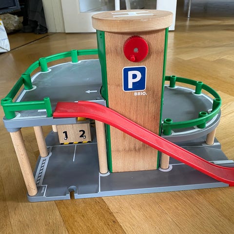 Parkeringshus med flere etager og ramper. Fremstillet i træ med malede detaljer i rød, blå og sort. Designet til børn og egnet til leg med små biler og køretøjer.