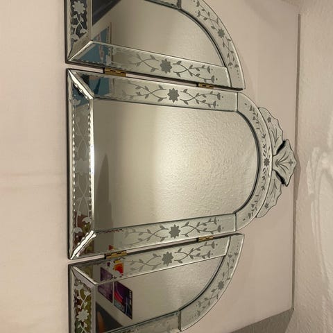 Et venetiansk spejl samt to matchende væglamper - i flot og velholdt stand - der mangler dog en enkelt "blomst" på spejlet.