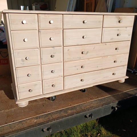 Fin købmandsdisk i massiv fyrretræ med messinggreb fordelt på 15 skuffer! Top pladen måler i bredden på undersiden: 133cm!!!