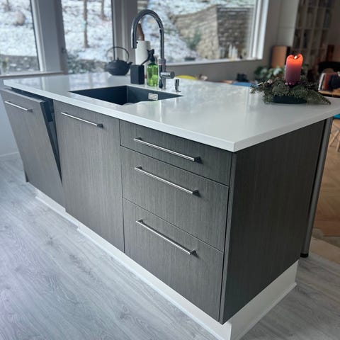 Under bordpladen i øen er i alt 6elementer. På den ene side: 1x 60cm skab med skuffe, et vaskeskab samt en opvaskemaskine (vi har en ekstra låge) og på modsatte side 3x 60cm skabe 35cm dybe med push.