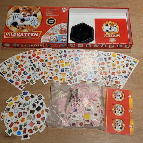 Vildkatten brætspil med 400 billeder. Spillet indeholder forskellige kategorier og billeder til brug for familiespil og underholdning.