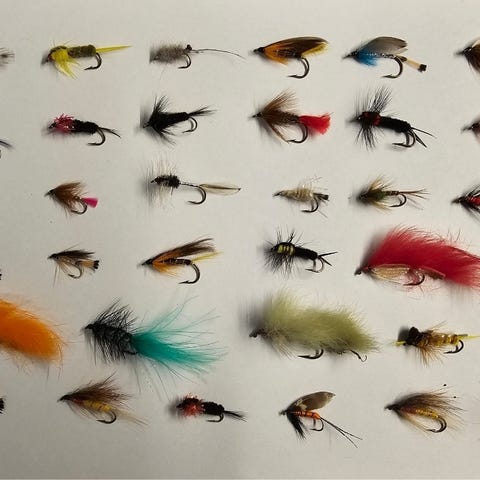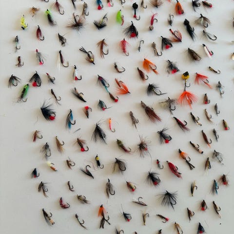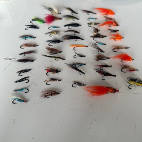 Havørred og Laks fluer til åen. Det er utroligt mange fluer. Mvh