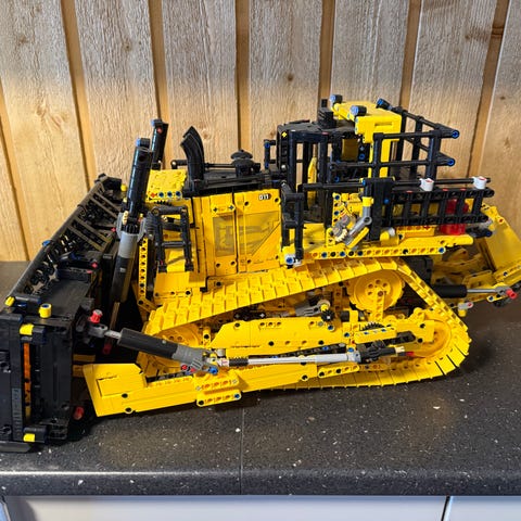 LEGO Technic Bulldozer legetøj i gul og sort farve. Modellen er detaljeret med bevægelige dele og egner sig til børn med interesse for teknik og bygning.
