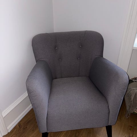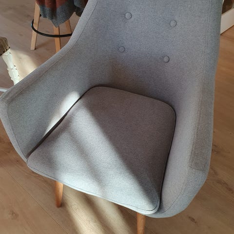 Grå lænestol som er behagelig at sidde I. Har nogle pletter på det ene armlæn. Syning er ved at gå op et enkelt sted som vist på billede nr 2