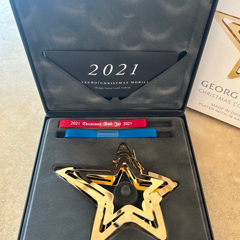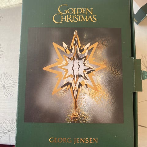 Georg Jensen Jul Stjerne Dekoration i metal med en gylden finish. Designet som en stjerne med flere lag og en spiralformet base til montering på juletræet. Egnet til brug som julepynt.