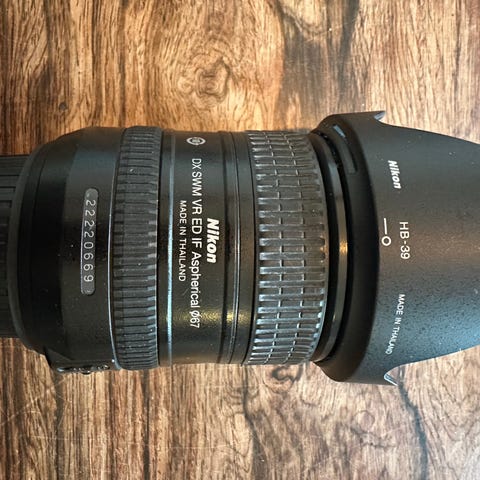 Nikon DX 16-50mm objektiv med en blænde på 3.5-6.3. Objektivet er designet til brug med Nikon kameraer og tilbyder en brændvidde på 16-50mm. Nypris dd ca 2550,-