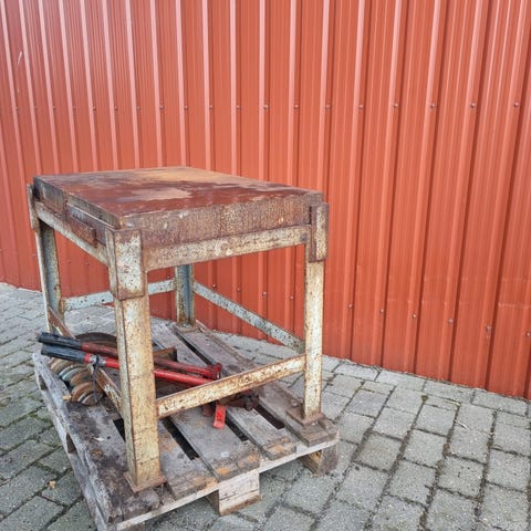 Paramo metalskruestik monteret på et robust arbejdsbord med metalplade. Bordet har en firkantet form og ben af metal. Skruestikken er fastgjort til bordpladen og egnet til værkstedsbrug.