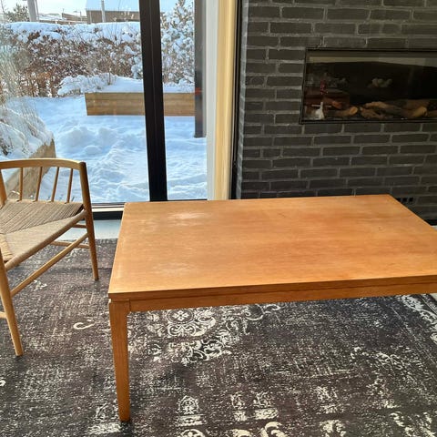 Super flot sofabord i massiv egetræ og flet hylde i papir snor. Sofabordet sælges til en meget lav pris, eftersom bordpladen har en lille revne. Sofabordet er helt nyt og aldrig brugt.