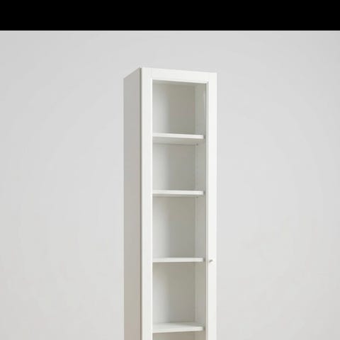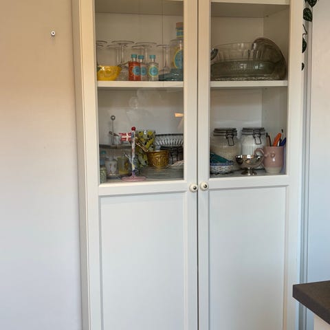1 stk. Smal Billy vitrineskab fra Ikea. Har overskab, er blot taget ned. En lille rift i bagbeklædning (usynlig) som ses på billede.