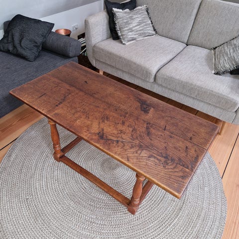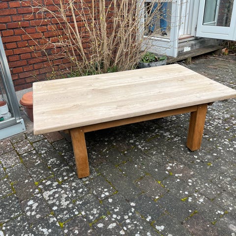 Rustikt og solidt egetræs sofabord. Toppen ikke fastgjort. Afhentes på Frederiksberg.
