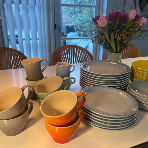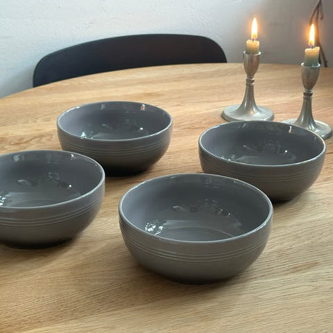 Le Creuset stel service i grå keramik bestående af tallerkener, skåle og kopper.