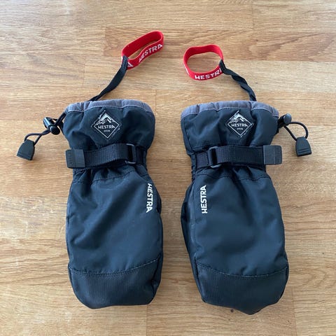 Varme, vandtætte og åndbare på indersiden vinter/skihandsker i str. 7, Junior imprægneret skind i håndflade, udtagelig for, snelås, uld inder handsker i str. 6 brugt til to skiferier. OBS. Junior str.7
