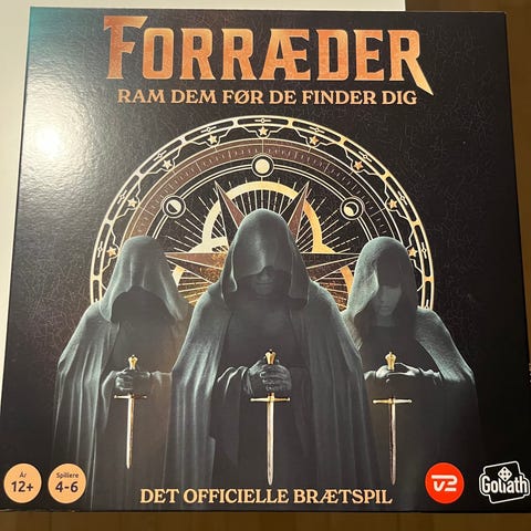 Forræder brætspil, officiel version, egnet til 12 år og ældre. Spillet involverer strategiske elementer og samarbejde mellem spillere.