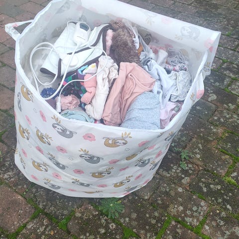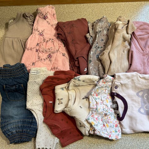 Sælger alt dette for kun 1500 kr : indeholder bla. hovedsagelig pigetøj fra str 50 til str 116, sengetøj, håndklæder, klæd ud tøj, tæpper, legetøj, slyngevugge, pusletaske, vikle, autoclave, tallerkner og krus i plast, bøger, bamser, plakat( plastkasserne og reol medfølger ikke)