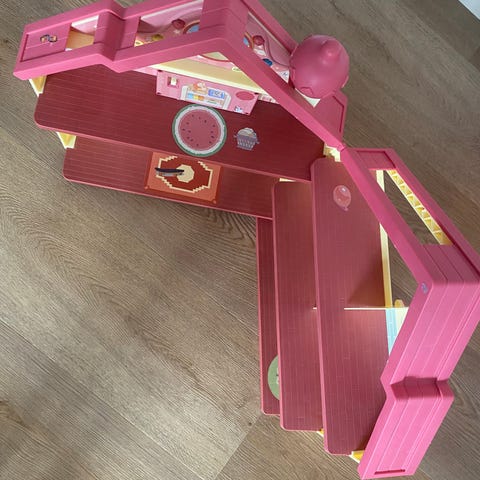 Bluey legetøj hus med tilbehør bestående af møbler, figurer og små genstande. Indeholder et hus med flere rum, møbler som senge, stole, badeværelsesudstyr, og diverse små figurer. Materiale og størrelse ikke angivet. Egnet til børn til leg og fantasiudvikling.