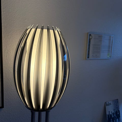 Herstal gulv standerlampe, højde 120 cm. Touch dæmp bar, rør lampen og den slukker, rør igen og den tænder, rør og hold ved den dæmper den lysstyrke. Desværre er foden ikke så pæn, det kan man vælge at lade være eller evt. male den, se fotos.