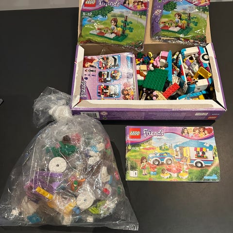En hel balje med blandet LEGO friends klodser i forskellige farver og størrelser.