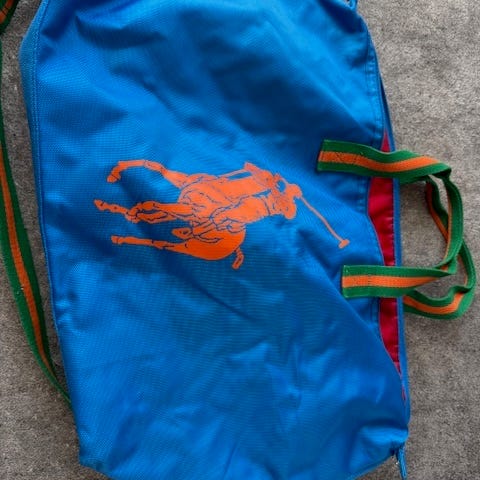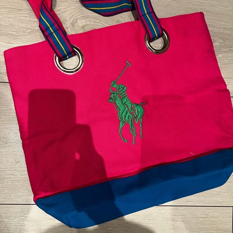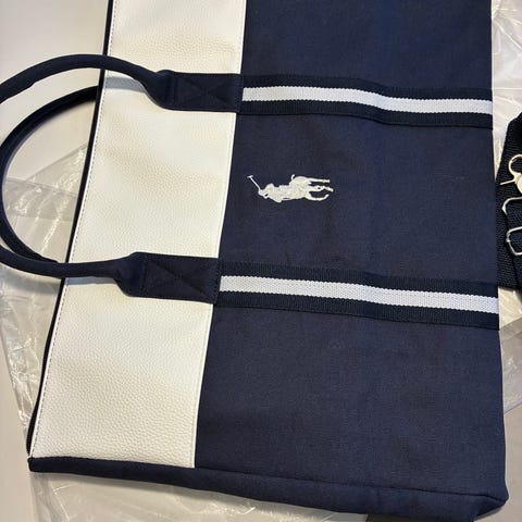 Polo Ralph Lauren unisex taske fremstillet i læder. Tasken har en kombination af hvide og mørkeblå farver med et synligt Polo-logo. Den har en lynlåslukning med en læderdetalje på lynlåsen. Taskens design er enkelt og funktionelt.