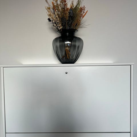 Fin og funktionel skrivepult / væghængt skrivebord. Lågen kan klappes ud og i, så alt rod fra brugen af bordet nemt gemmes væk.