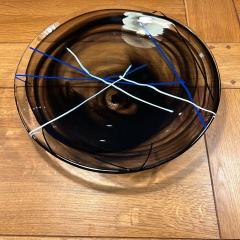 Glasfad med en diameter på 30 cm. Fadet er klart med en blå dekorativ detalje. Velegnet til servering eller som pynt.