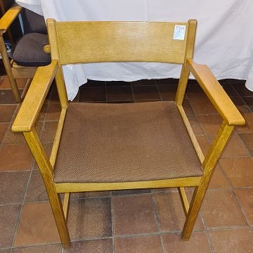 Model BM73 designet af Børge Mogensen. Den er i eg og stof. Betrækket trænger til at blive skiftet, derfor den lave pris. Er ellers stabil i stellet.