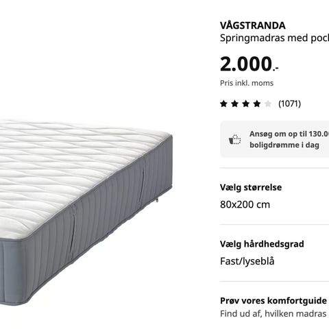 Topmadras fra IKEA. Brugt i 5 dage om ugen i 2 mdr. af efterskolepige (øverste køje, så har ikke været brugt som sofa😊). Ingen brugsspor. Betræk kan aftages og vaskes. To hvide kuvertlagener medfølger hvis ønskes. 80x200 cm.