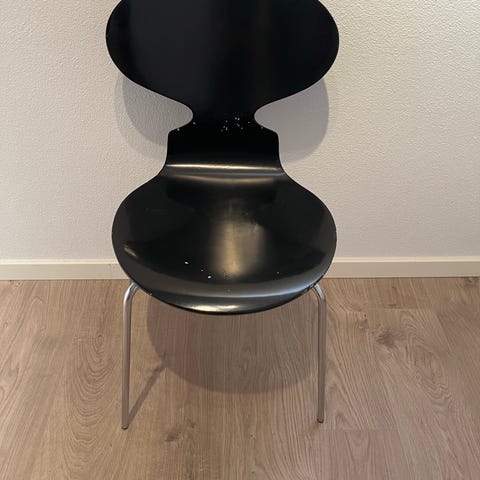 To sorte spisestuestole á la Myren. Stolene er et par gode, robuste stole. Dog har de brugsspor (se billede).