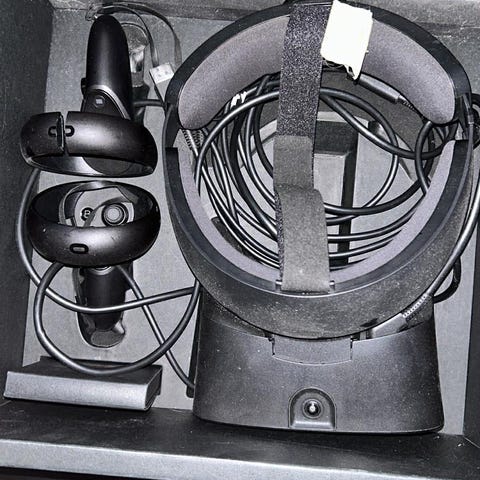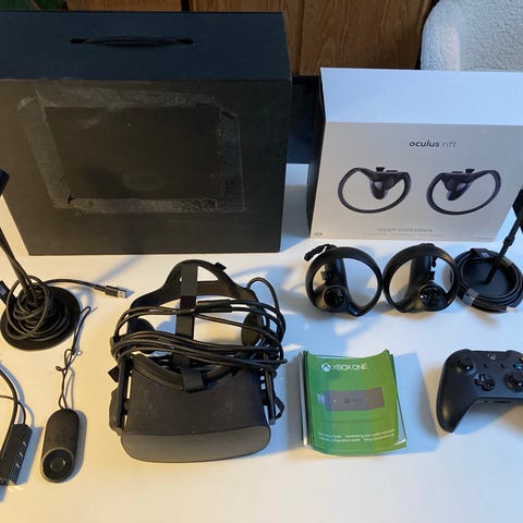 Oculus VR-headset med tilbehør. Alt virker som det skal, controllere skal nok snart bruge nye batterier. Oplader er blevet væk, men det bruger normal usb-c