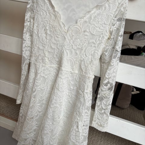 Den er rigtig elegant og i syet en underkjole i så det kun er ærmerne er er gennemsigtige. Den bindes til i nakken.