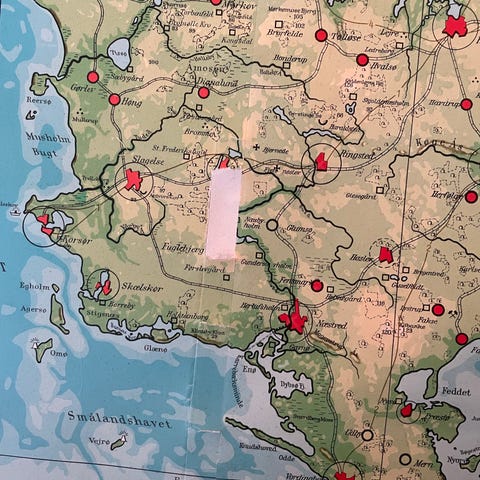 Gammelt skolekort med detaljeret kort over Danmark