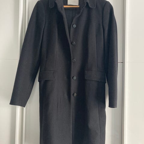 Hugo Boss Frakke i størrelse S til kvinder. Jakken er lilla/blålig med sort foer og har et bælte i taljen. Klassisk frakke model. Materialet er 90% uld og 10% cashmere. Længde fra top til bund ca. 105 cm. Længde på ærme målt fra underarm er 47 cm.