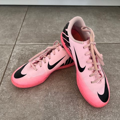 Nike CR7 - Christiano Ronaldo's indendørssko i størrelse 36,5. Skoene har en sort base med orange og lilla design og hvid Nike swoosh. Designet inkluderer CR7 logo på siden.