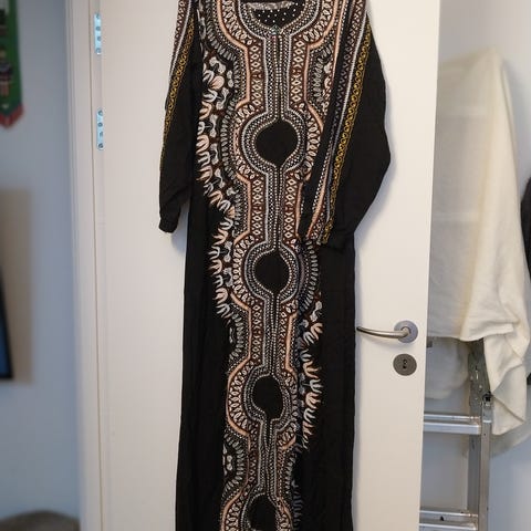 AFRIKANSK KJOLE MED VOKSBATIK. KJOLEN ER 93 CM LANG. I LIVET MÅLER DEN 70 CM. LYNLÅSEN ER 36 CM LANG.