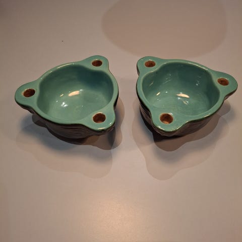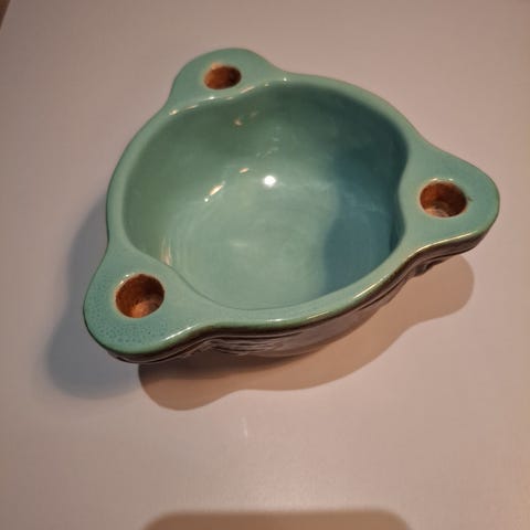 Lysestage og skål i en. Mørkebrun udvendig. Mintgrøn indvendig. Under hvert lys er der et relief af et hoved af en engel.