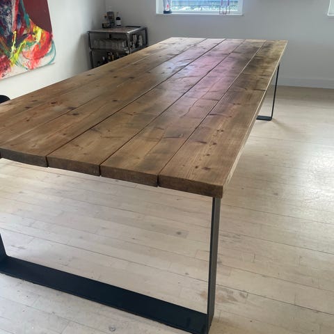 Plankebord med 3 planker og trapez-ben i støbejern.