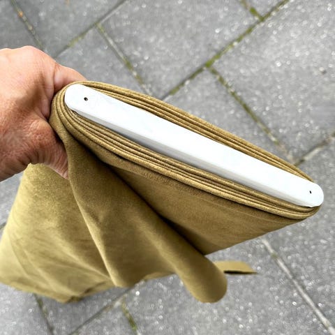 Jeg vil skyde på, at det er 1,5 x 2/3 meter i stof.