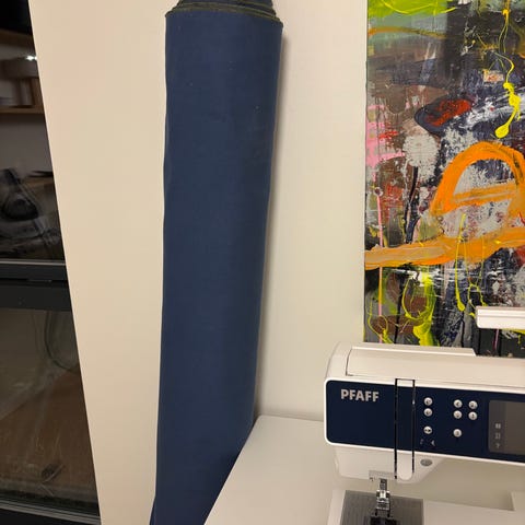 Blå/blå stofrulle i tekstilmateriale. Stoffet er blødt og egnet til beklædning eller indretning. Rullen er delvist udfoldet og viser stoffets overfladestruktur.