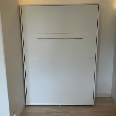 Denne vægseng (Klap-ned seng eller Murphy bed - kært barn har mange navne) af mærket Clei er en genial løsning, hvis man vil spare plads i dagligdagen eller have en ekstra seng i huset, som ikke tager plads. Selve kassen er kun 31 cm dyb og 156 bred, så den fylder virkelig ikke meget når den ikke er i brug. Når den er slået ud er den 215 cm (fra væg til fodende), og indeholder en super god 140 cm bred springmadras. Kvaliteten er helt i top både på konstruktion, lamelbund og springmadras. Det hele fremstår nærmest som nyt.