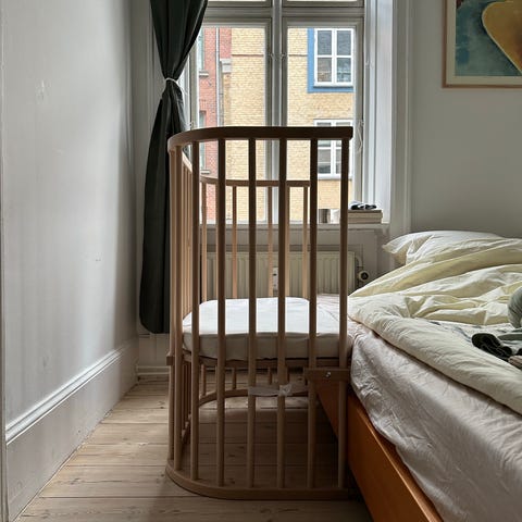 Inkl. Madras, sengerand og lagen. Kan fastgøres til voksensengen med medfølgende beslag.