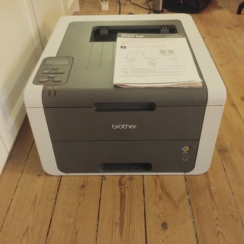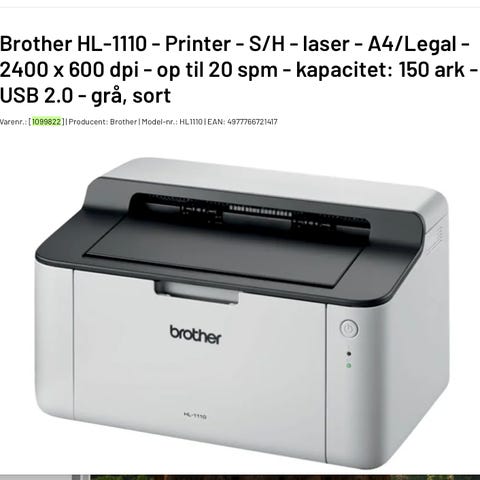 Brother HL-1110 printer with standard paper tray and toner cartridge compartment. Suitable for monochrome printing tasks. Works fine.