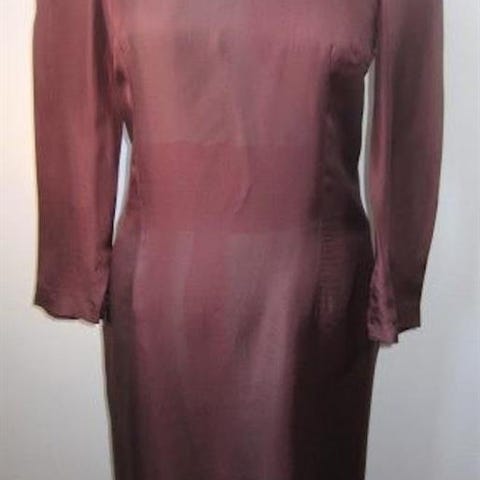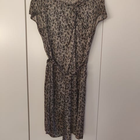 Louise Eeg kjole i silke, med et flot overflade mønster i creme og sort. Størrelsen er L, men der er bindebånd i taljen, og den passer fint også en størrelse 38. bemærk den fine detalje ved halsen og de enkle ærmer. Ser ud som helt ny, dejlig blødt 100% silke.