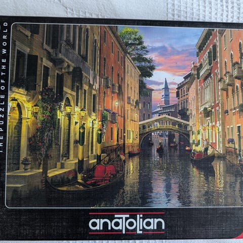 Maleri der viser et bymotiv fra Venedig med gondoler og historiske bygninger i baggrunden. Indeholder klare farver og detaljeret gengivelse af vand og arkitektur.