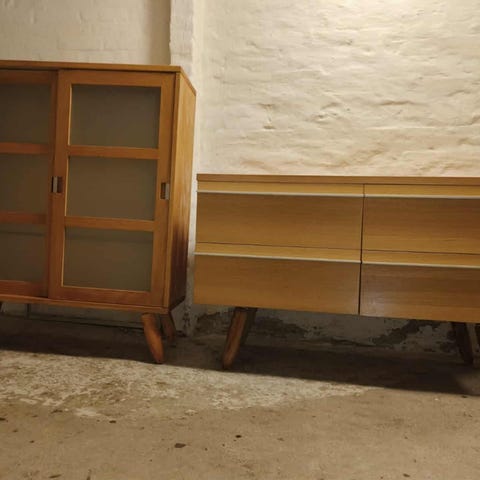 Vintage reoler/skabe i lyst egetræ. Meget velholdt. Sælges samlet eller enkeltvis.