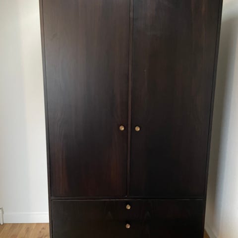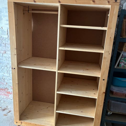 Fint garderobeskab i god stand lavet af lys massiv fyrretræ. Ekstra hylder følger med