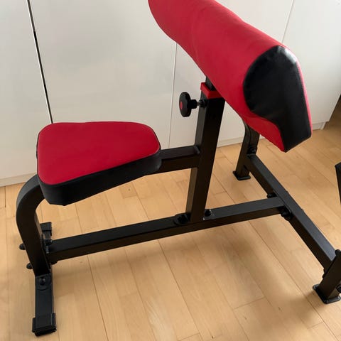 Robust og velkonstrueret bicepsbænk med en enkelt og nem låsemekaniske til at indstille højde og længde. Sælges med 120 cm SZ Curlbar med spinlock og 27,5 kg vægtskiver.