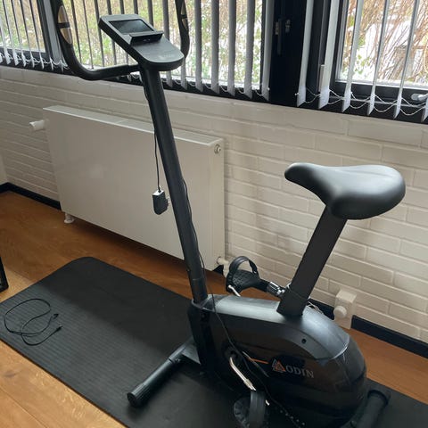 Odin motionscykel med justerbart modstandsniveau fra 1 til 8 og digitalt display til tidstagning. Cyklen har et stabilt stel og er designet til indendørs træning.