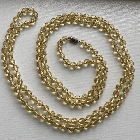 Lang halskæde med glasperler i forskellige farver og størrelser - længde ca. 148 cm. - fremstår i pæn brugt stand.