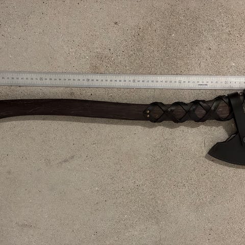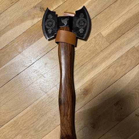 Håndlavet viking økse med træskaft og indgraveret stålblad. Øksen har detaljeret mønster på bladet og en læderrem med flettet læderbeskyttelse om skaftet. Designet til brug som dekorativt eller funktionelt redskab.
