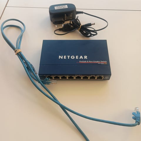 Netgear 5 Port Gigabit Netværksswitch med 5 porte til kablet netværksforbindelse. Enheden er designet til at forbinde flere netværksenheder og understøtter gigabit hastigheder for hurtig dataoverførsel.